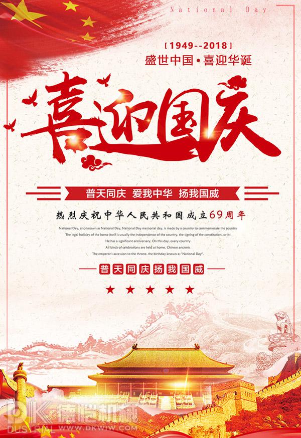 秋高氣爽國慶節(jié),舉國歡慶吉祥到,張燈結(jié)彩焰火舞,人潮如涌街巷滿,紅旗獵獵隨分飄,國泰民安幸福來。德愷機(jī)械全體員工祝大家國慶節(jié)快樂!